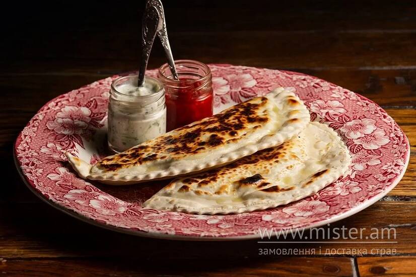 Січене м`ясо баранини, свіжа зелень та спеції загорнуті у прісне тісто й обсмажені на гарячій пательні. Подаються з соусами аджика та мацоні.
