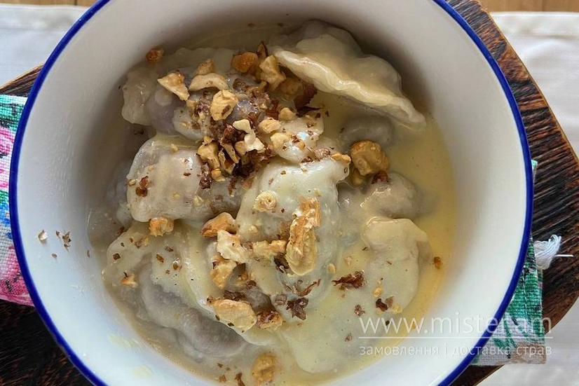 Ресторація "Гопачок" Вареники з вишнею у ванільному соусі з горішками