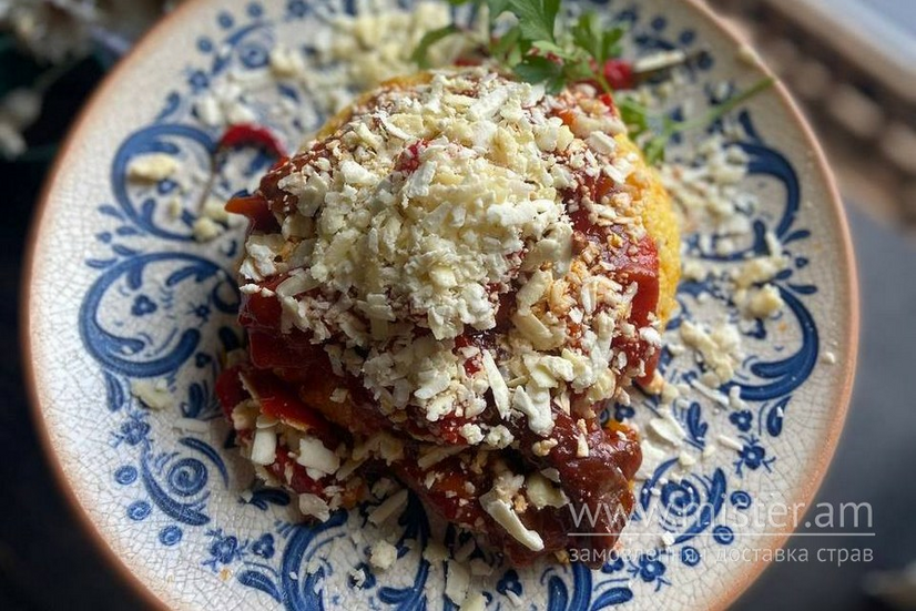Гостра телятина з овочами в помідоровому соусі. Подається на мамализі з бринзою або на часниковій грінці.