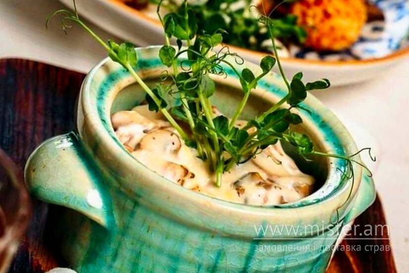 Шматочки філе свинини у грибній поливі, подаємо з дерунами в мініатюрі.