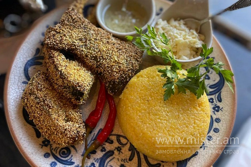 Обсмажені у кукурудзяному борошні. Подаємо у традиційному буковинському пейрінгу з мамалигою, бринзою та саламахою.