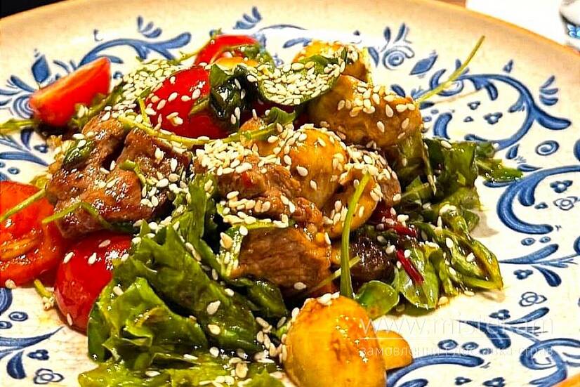 Шматочки телятини, грильовані овочі, печериці, свіжа зелень та насіння соняшника, заправляємо легким соєвим соусом.