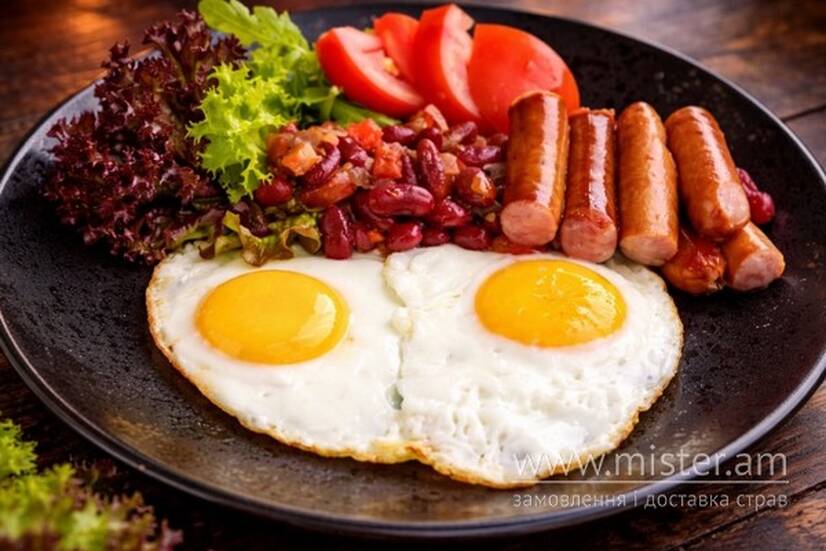 Глазунья з мисливськими ковбасками та зеленим горошком, помідори та огірки.