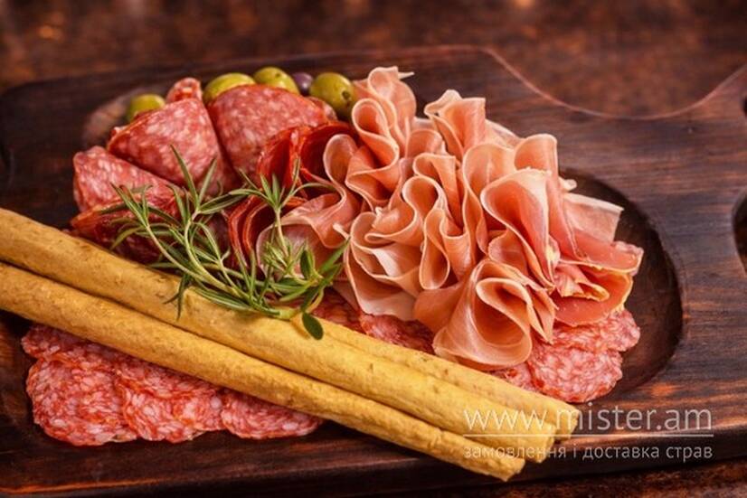 Салямі золотисте та салямі з перцемі, прошутто, мариновані оливки, гріссіні.