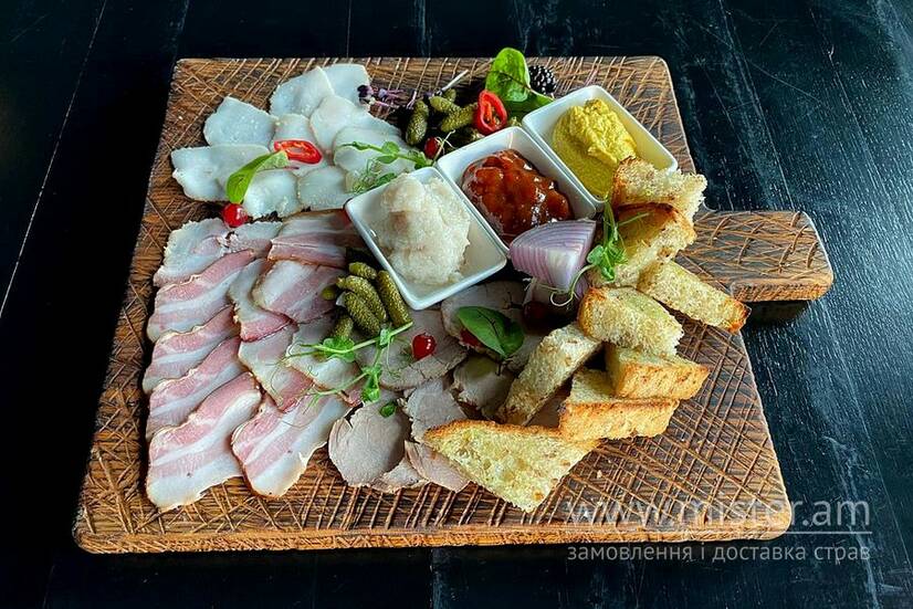 Cало солене, сало мелене, буженина, бекон, грінки, корнішони мариновані, соус "Барбекю", гостра гірчиця/