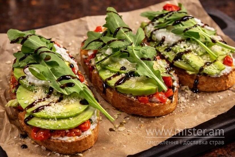 Авокадо, фета, зелень, соус бальзамік, пармезан, Філадельфія, перець болгарський, пармезан.