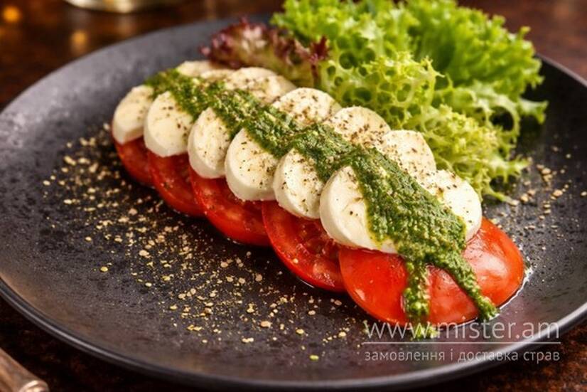 Класика італійського смаку: свіжі томати, листя базиліку та моцарелла.