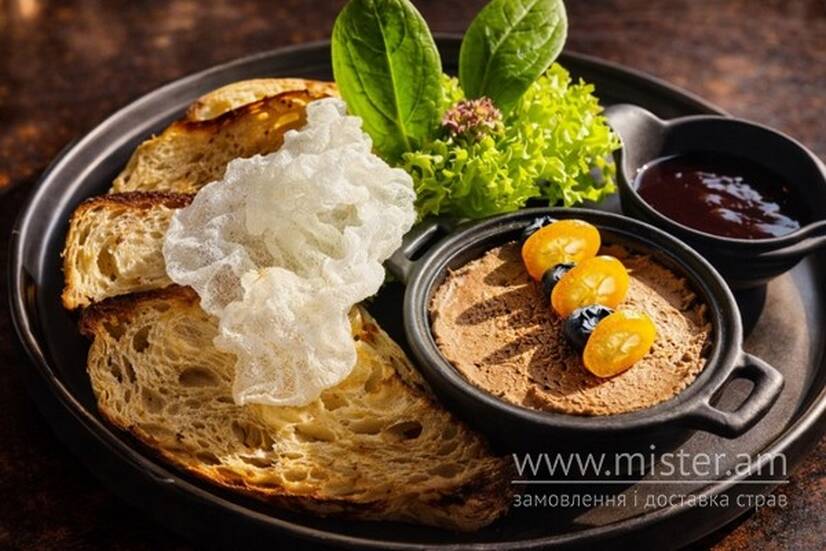 Паштет з курячої печінки, сирні грінки з часником.