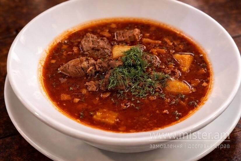 Ребра копчені, телятина, свинина, картопля, зелень, чилі, цибуля, помідори, морква та перець болгарський.