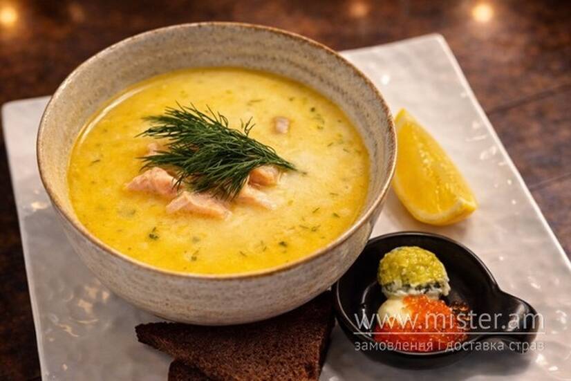 Лосось, картопля, вершки, ікра гольця та форелі, грінки, вершкове масло з кропом.