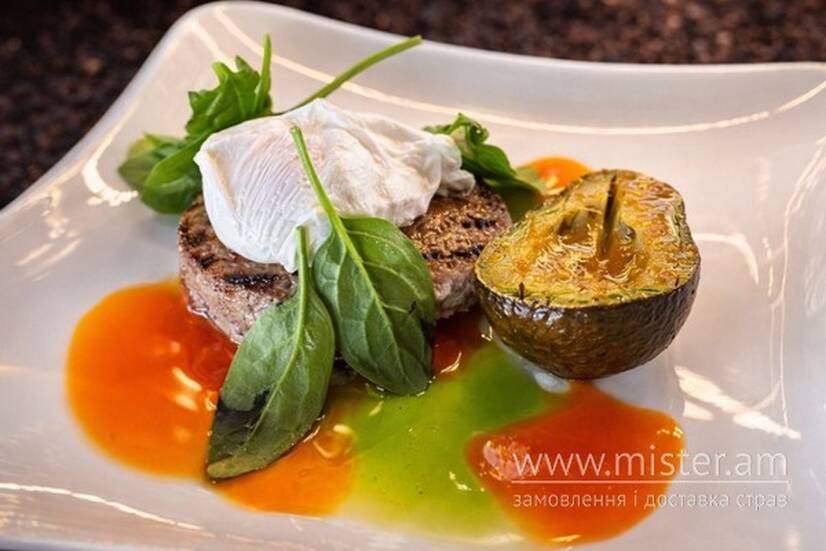 Соковитий біфштекс із ніжним авокадо, яйцем пашот і ароматним медово-гірчичним соусом.