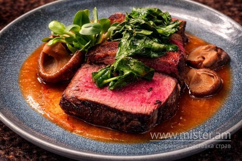 З картопляними оладками та грибами шиїтаке під соусом "Деміглас".