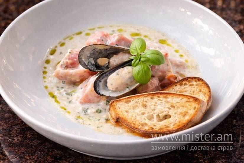 Мідії, тигрові креветки, щупальця кальмара, морський гребінець, вершковий соус, чіабатта.