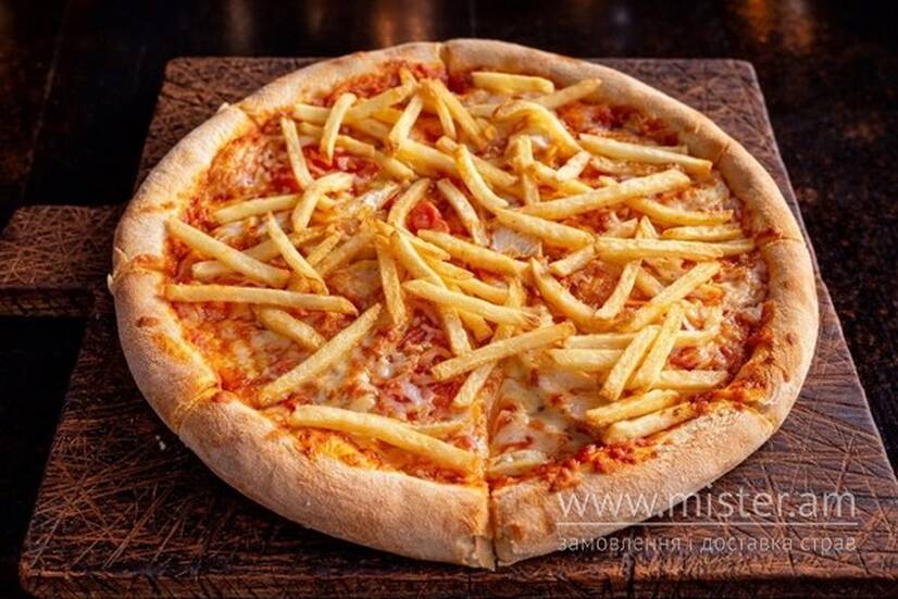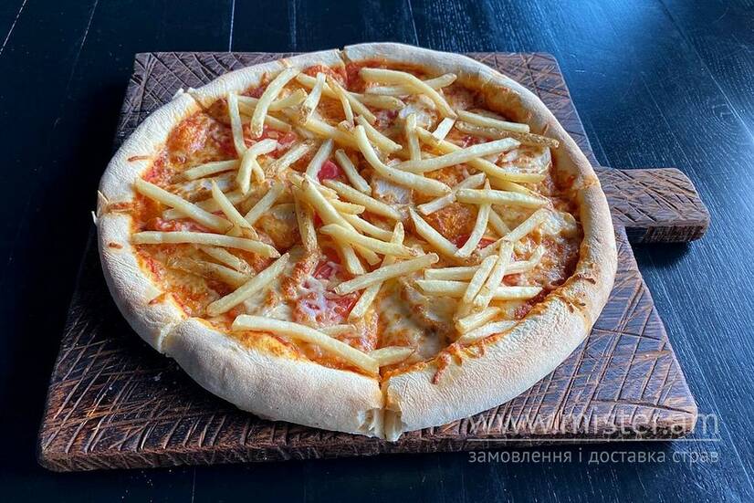 Куряче філе, картопля фрі, помідори, моцарелла, пармезан, томатний соус.