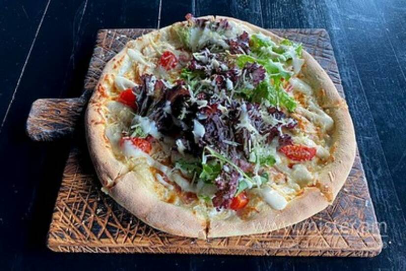 Куряче філе, бекон, помідори чері, мікс салату, пармезан, моцарелла, соус вершковий, соус Цезар.