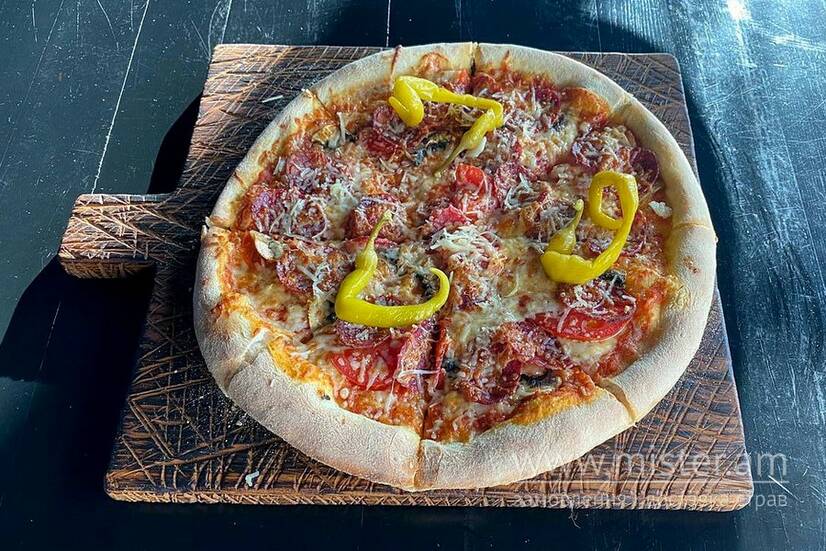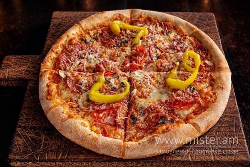 Салямі, перець пепероні або гострий чілі, помідори, печериці, моцарелла, томатний соус.