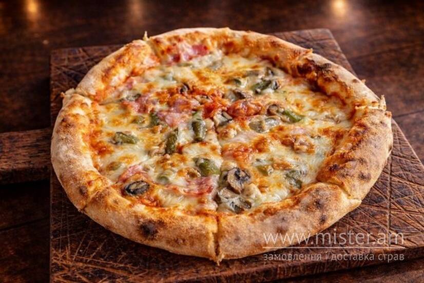 Бекон, печериці, корнішони, сир, томатний соус.