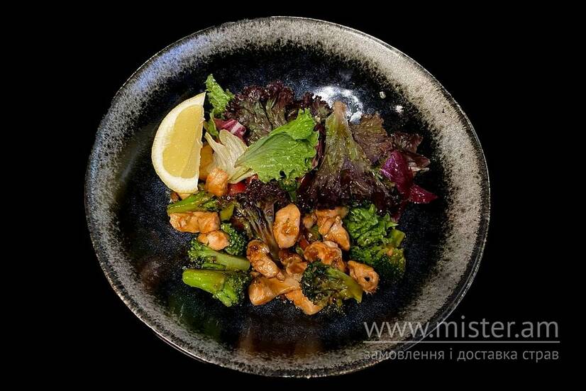 Лосось, томати чері, горгонзола, мікс салатів, брокколі, соус унагі.