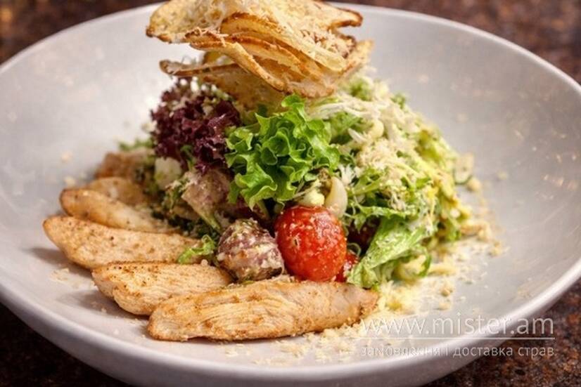Мікс салату, томати чері, смажений бекон, крутони, пармезан, соус "Цезар".