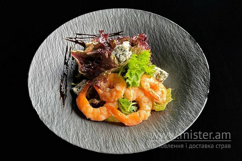 Креветки тигрові, авокадо, томати чері, горгонзола, мікс салатів, соус "Песто".