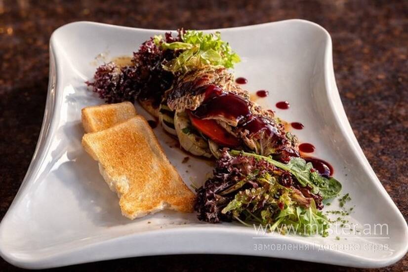 Мікс салату, баклажан, перець болгарський, кабачок, цибуля, грінки тостерні обсмажені, ягідний соус та салатна заправка.