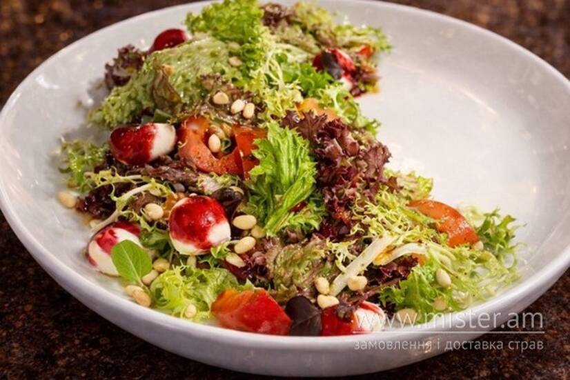 Моцарелла, томати, перець, огірок, листя салату,кедровий горіх, ягідний соус та салатна заправка.