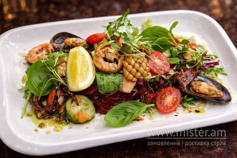 Восьминіг, кальмар-квітка, тигрова креветка, мідії в мушлях, томати чері, морква, огірок, оливкова олія, заправлється ароматним соусом на основі меду ,часнику,соєвого соусу та вершкового масла.