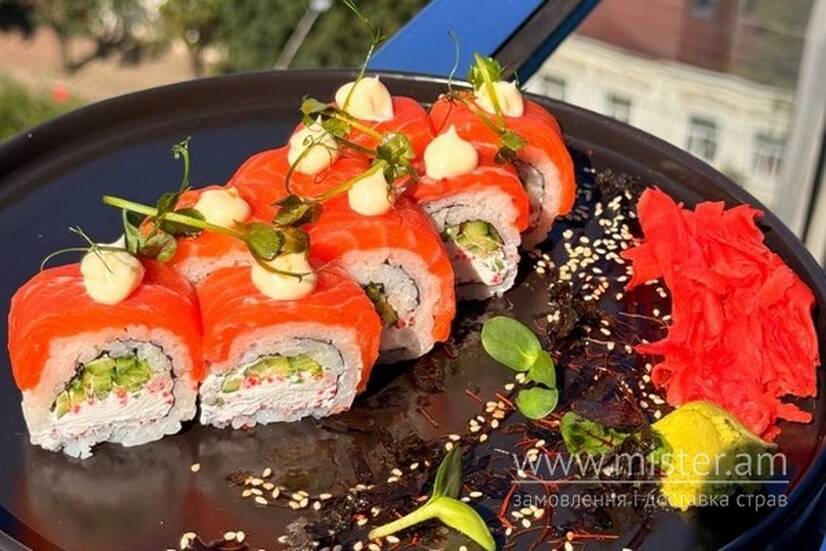 Лосось свіжий, вугор, ікра тобіко, Філадельфія, огірок, майонез.