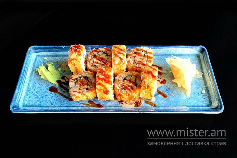 Філадельфія, ікра тобіко, огірок, креветка, соус темпура.