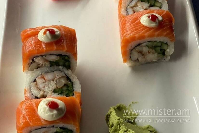 Вугор, креветка,огірок, лосось, майонез, шрірача.