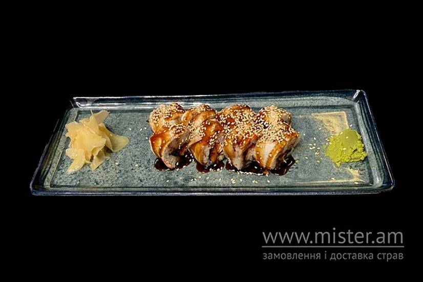 Вугор, ікра тобіко, кунжут, Філадельфія, огірок, соус унагі.