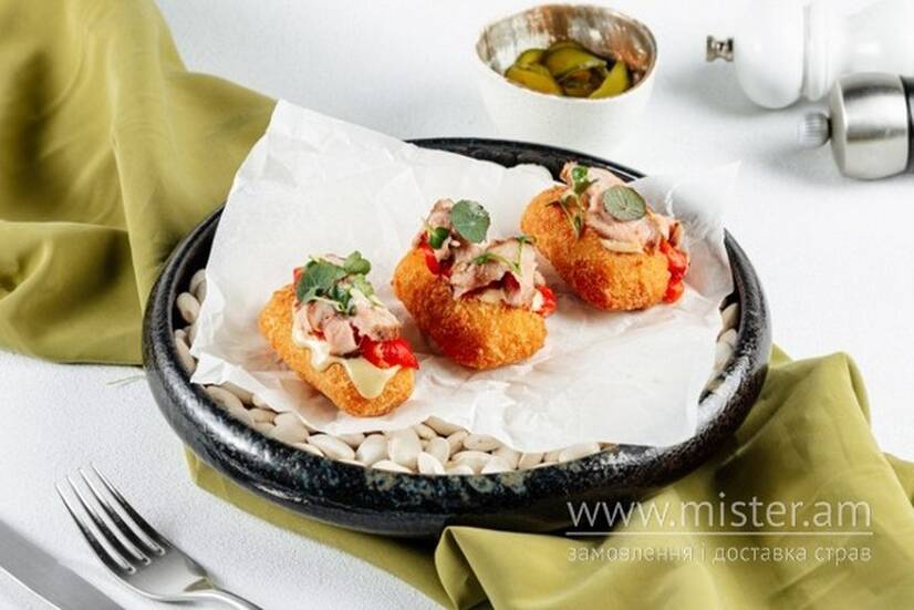 Шматочки яловичини, які подаються на картопляних крокетах з маринованим печеним перцем та соусом Цезар, а також маринованими огірками.