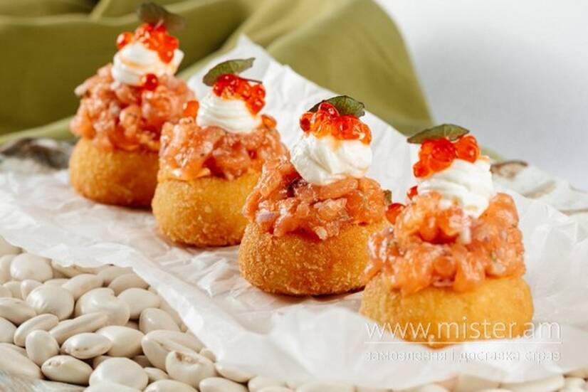 Тар-тар лосося на картопляних крокетах з лимонним крем-сиром, каперсами, цибулею шалот, соусом спайсі та червоною ікрою.