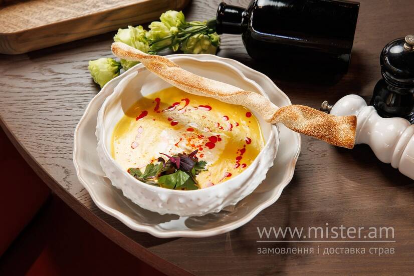 Ніжний кукурудзяний крем на вершках і бульйоні з чедером, цибулею та часником, поданий із копченою куркою, страчателлою та грісіні.