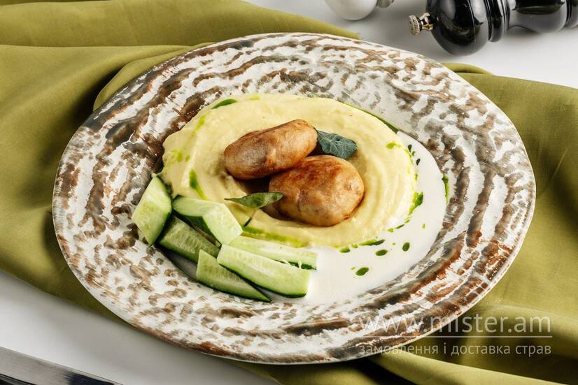 Котлети курячі, картопляне пюре, пармезановий соус, огірок.