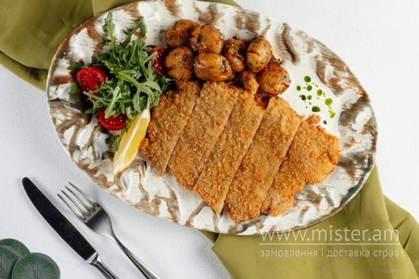 Свинний шніцель, картопля бейбі, соус чімічурі, салат з томатів чері власної маринації та рукколи, соус з хрону, лимон.