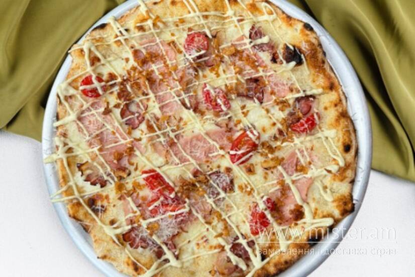 Свинна шинка, куряче філе копчене, моцарелла, томати чері, вершкова основа, пармезан, соус Цезар, цибуля кранч, базилік, руккола.