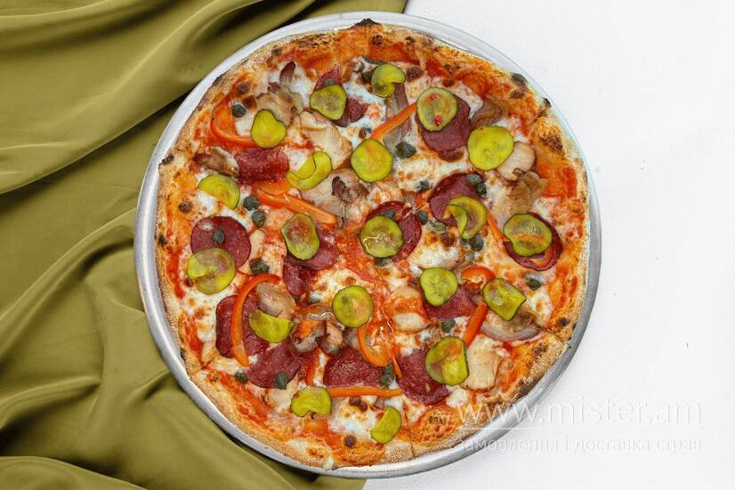Тісто тондо романа, соус пелаті, моцарела, підчеревина, куряче філе копчене, салямі, маринований огірок, каперси, перець болгарський.