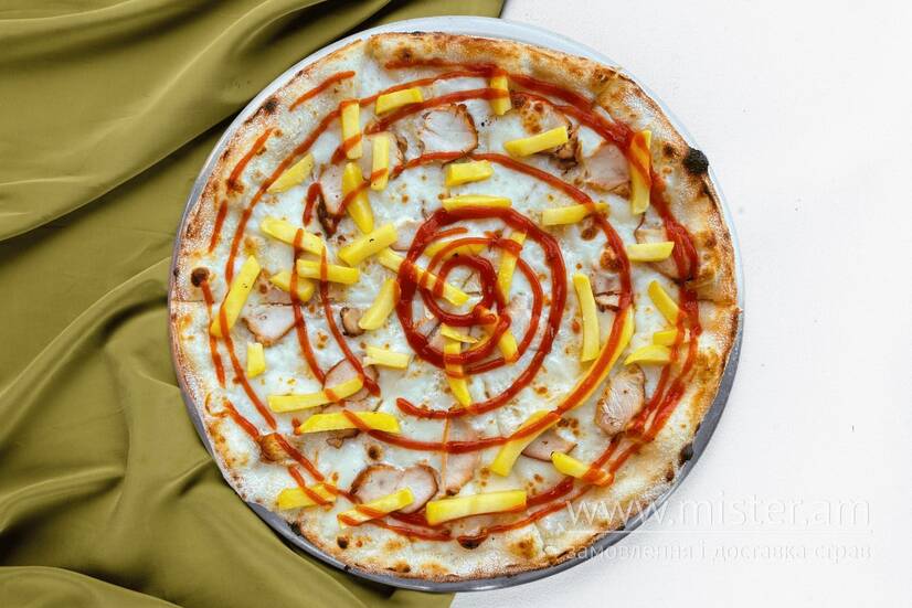 Картопля фрі, куряче філе підкопчене, кетчуп, моцарелла, вершкова основа.