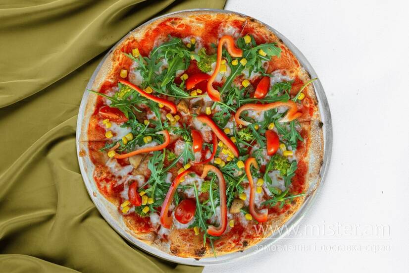 Тісто тондо романа, моцарела, соус пелатті, брокколі, карамелізовані печериці, перець болгарський, кукурудза, руккола.