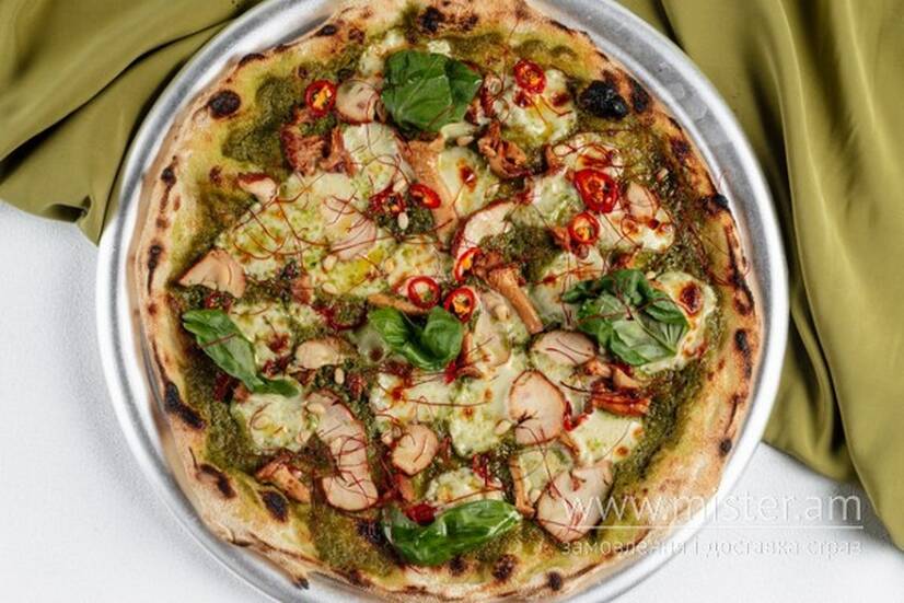 Тісто тонда романо, копчене філе курки власного виробництва, смажені лисички, моцарелла, базилік, нитки чилі, перець чилі, соус на основі оливкового песто, поливається трюфельною олією.