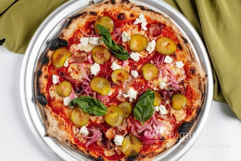Тісто тонда романо, копчена підчеревина власного виробництва, фермерська бринза, маринована цибуля, мариновані огірки, соус на основі томатів пелаті.