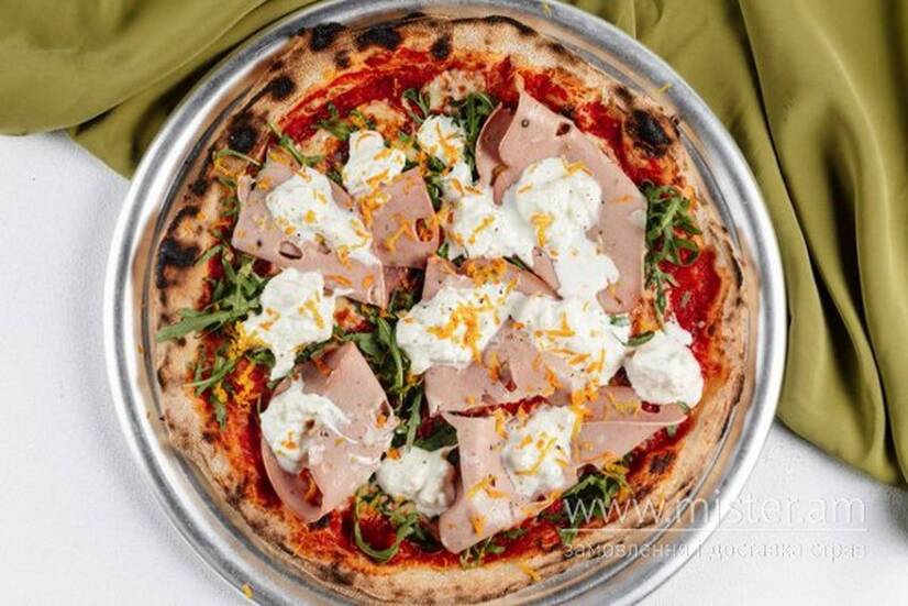 Тісто тонда романа, мортадела, страчателла, рукола, базилік, фісташки, цедра апельсину, свіжомолотий перець, соус на основі томатів пелаті.
