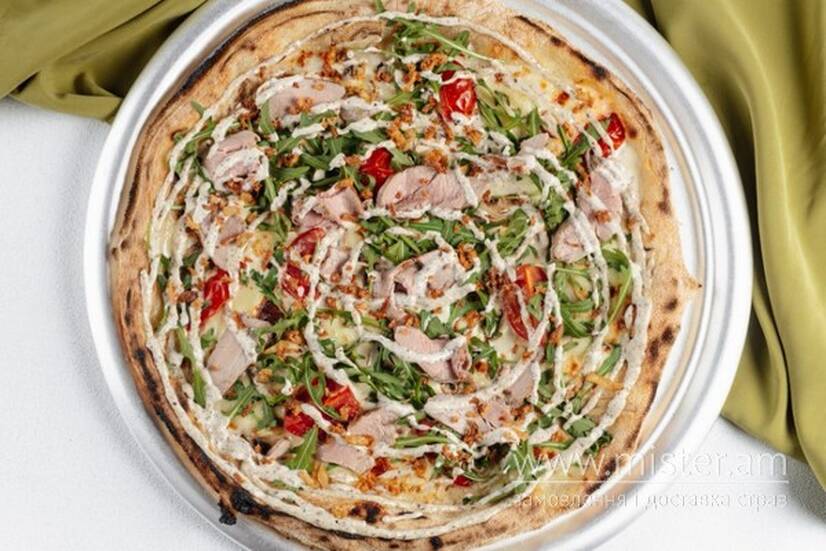 Тісто тонда романа, пастрамі, печериці, моцарела, рукола, томати чері, кріспі цибуля, ніжна вершкова основа, поливається трюфельним соусом.