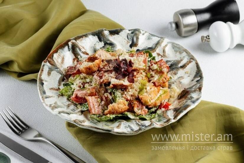 Обсмажене куряче стегно, бекон, яйце куряче, томати чері, салат ромен, соус Цезар, пармезан.