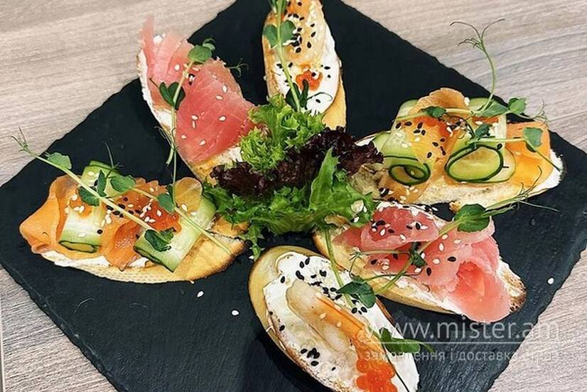 Тигрова креветка, тунець холодного копчення, лосось слобосолений.