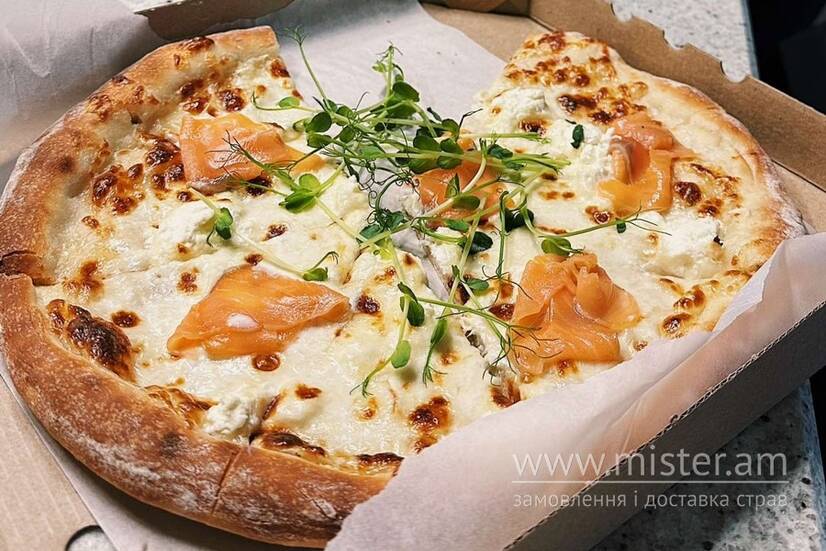 3 види сирів, лосось, руккола, орегано, вершковий соус.