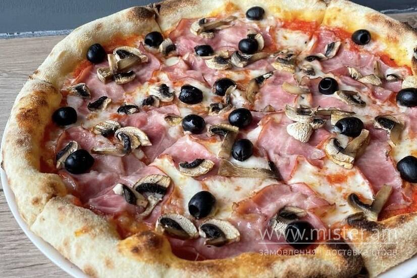 Сир Моцарела, шинка, маслини, печериці, томати, томатний соус.