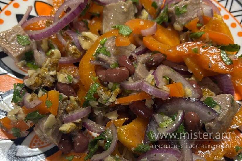 Яловичина, квасоля, перець болгарський, цибуля червона. Заправляється олією та часниковим соусом.