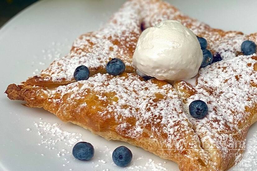 Конвертик з листкового тіста з начинкою з вишні та шоколаду. Подаємо з кулькою морозива.